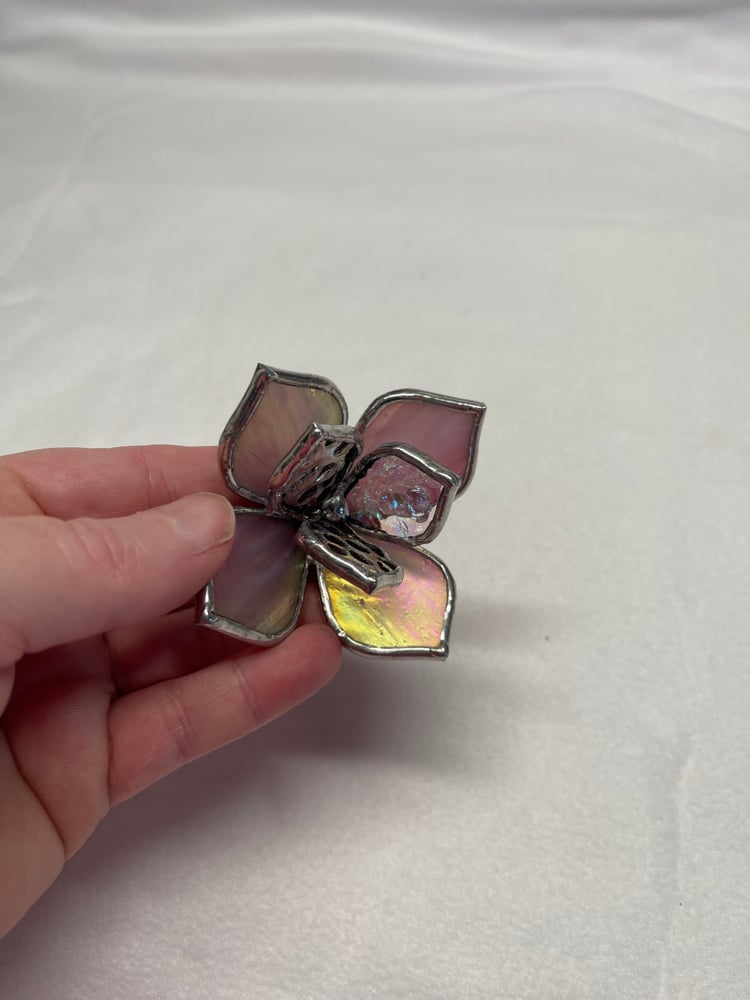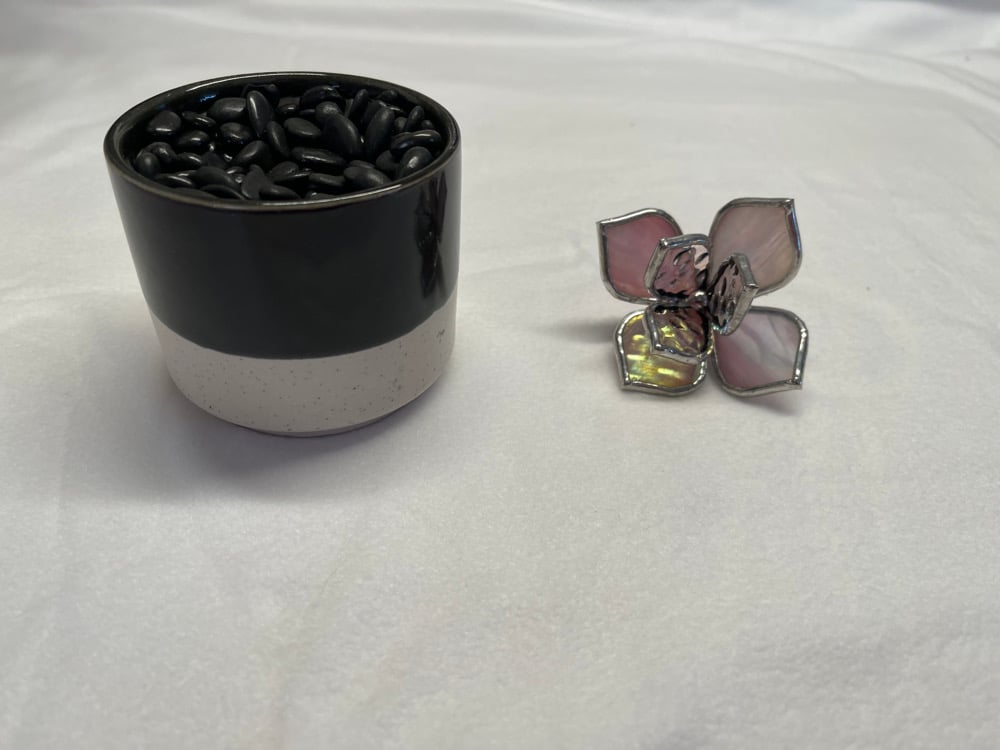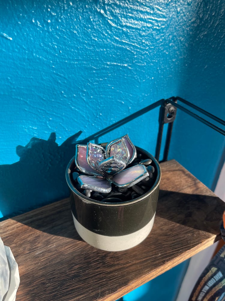 Mini succulent with pink and clear iridized leaves. Comes with a blank and white pot and black accent rock. Measures approximately 3.5in tall x 3.5in wide (inclusive with pot).