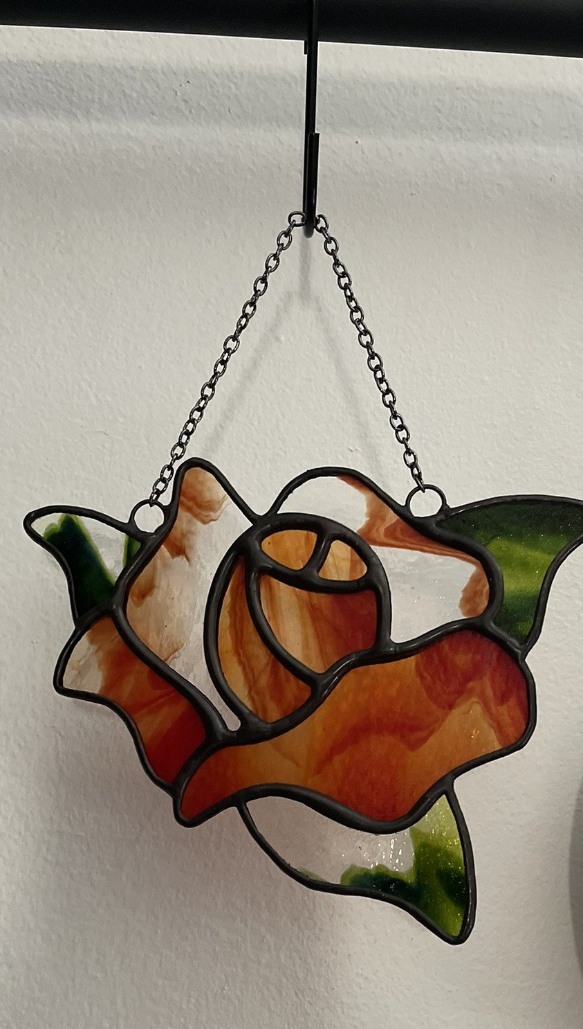 Red and clear steaked glass rose with clear and glitter green streaked leaves. Measures approximately 6.5inx5.5in.